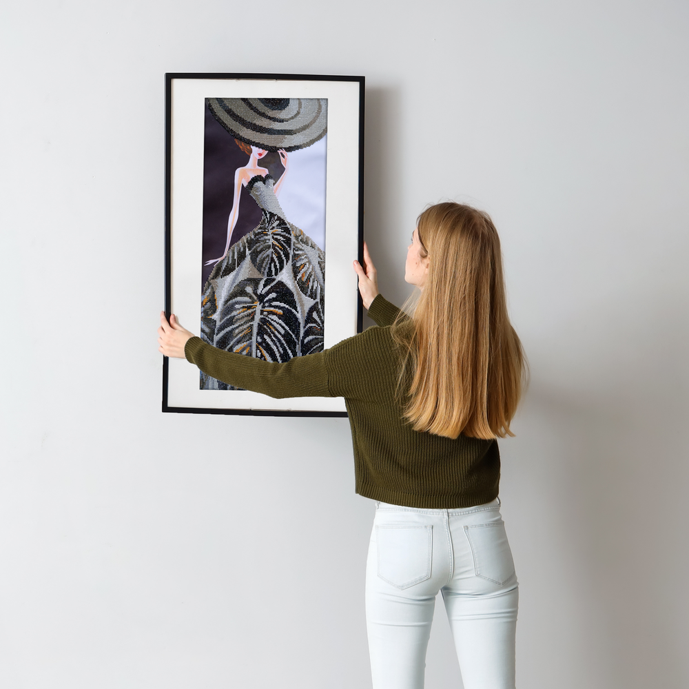 Turn heads with this fashion-forward Diamond Dotz kit by artist Alina Eydel. “Tropical Splendor” features a glamorous figure dressed in an elegant black gown patterned with bold tropical leaves topped off with a dramatic wide-brimmed hat. This sophisticated design is a showstopper for crafters who love Diamond Painting Kits for Adults and high-style Diamond Art Kits with a tropical twist.