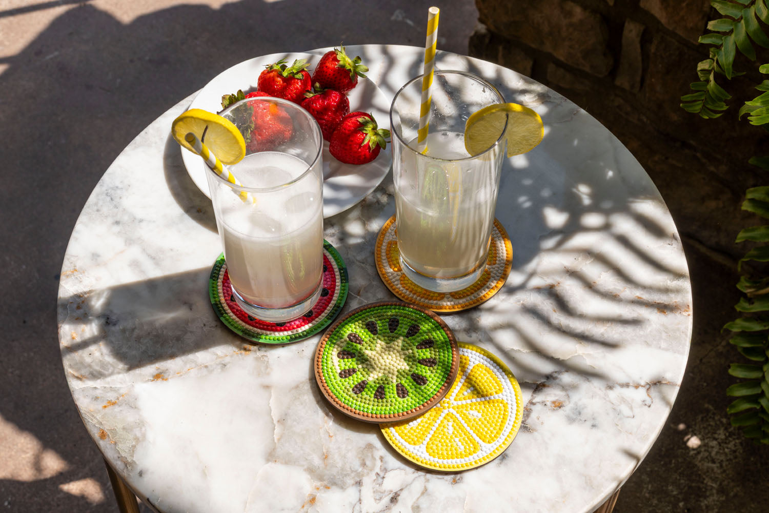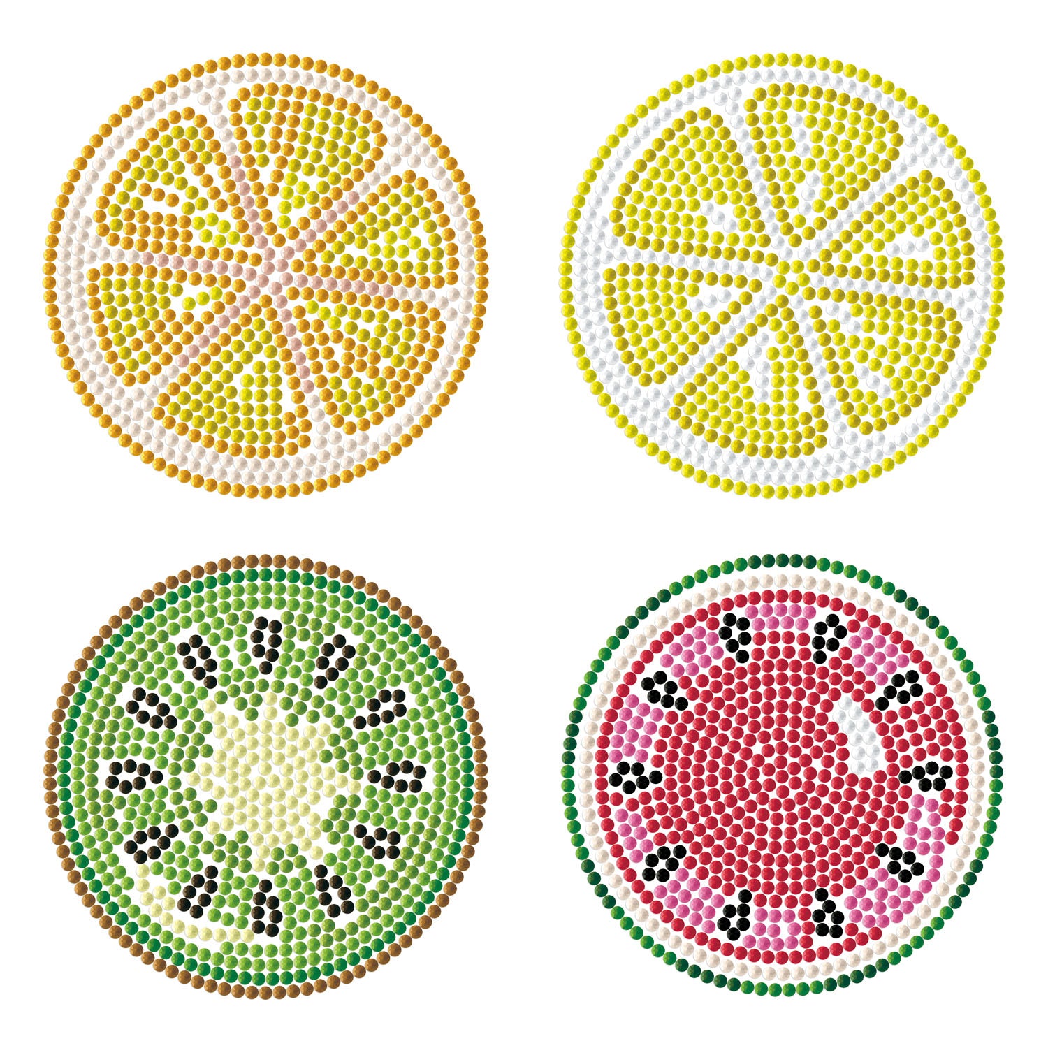 Sweeten your space with the Diamond Dotz Tutti Frutti Coaster Set! This fresh and fruity collection features four vibrant designs: an orange, a lemon, a kiwi, and a watermelon. With full coverage round DOTZ, these cheerful, beginner-friendly diamond painting projects are a perfect afternoon craft. Diamond Dotz Coaster Kits include coasters, Dotz, tools, and instructions.