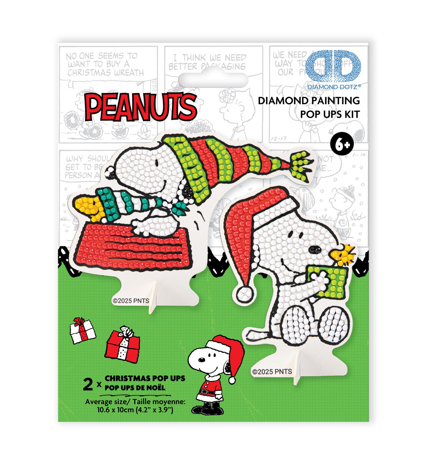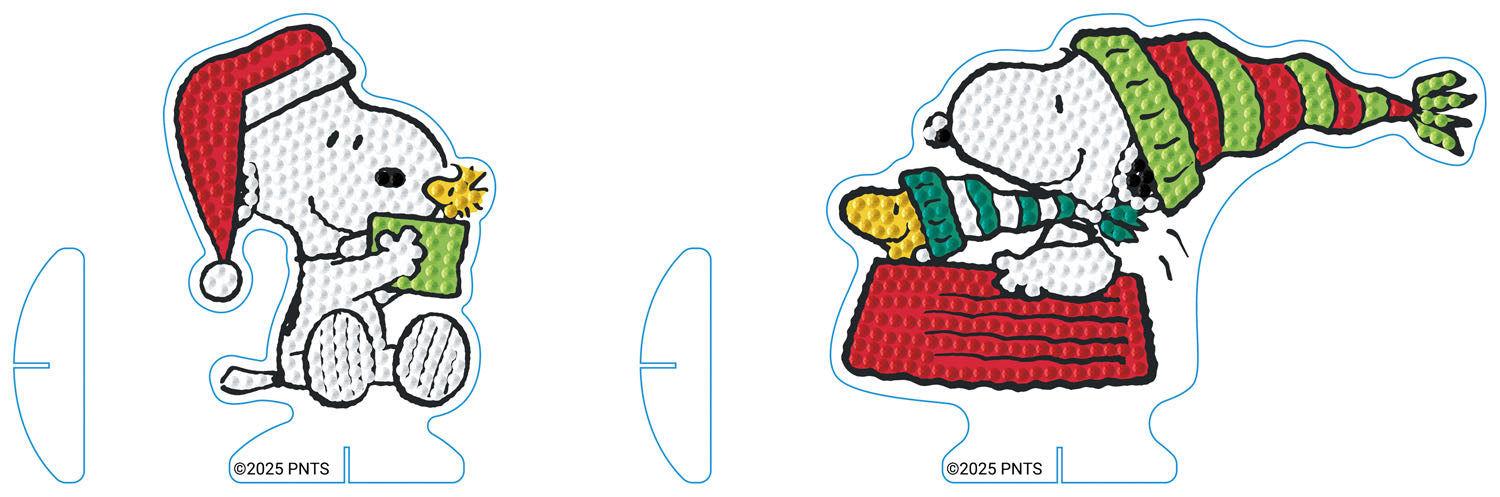 Double the fun and festive cheer with the Peanuts Christmas Pop Ups Twin Pack diamond art kit. This two-pack of stand-up decorations features Snoopy reading a book and Snoopy and Woodstock relaxing in their winter hats. Beginner-friendly and full of holiday sparkle, these charming diamond art pop-ups are perfect for tabletops, mantles, or anywhere you want to add a playful touch of Peanuts holiday magic.