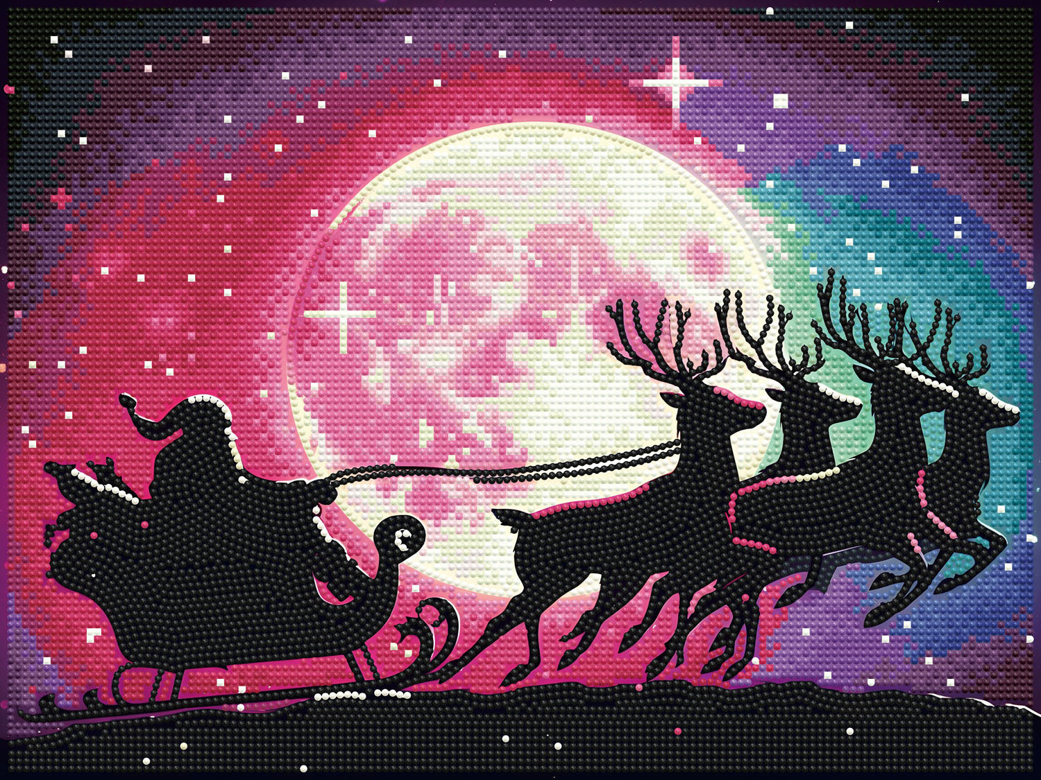 Take flight on a magical Christmas night with Santa’s Sleigh diamond art! This enchanting full coverage diamond painting showcases Santa and his reindeer against the backdrop of a glowing moon and a dreamy pink and teal sky. Create this holiday night scene that makes a beautiful holiday display year after year.
